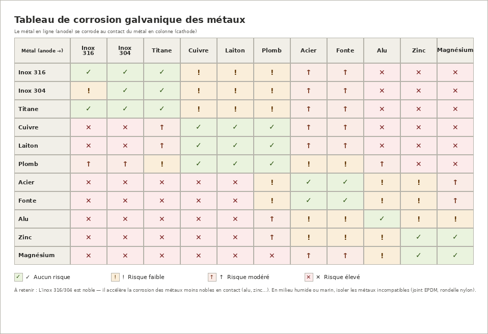 L'eau constitue un fluide électrolytique. C'est pourquoi il convient d'être beaucoup plus attentif aux risques de corrosion galvanique lorsque le garde-corps en inox est installé en extérieur et soumis aux intempéries.
