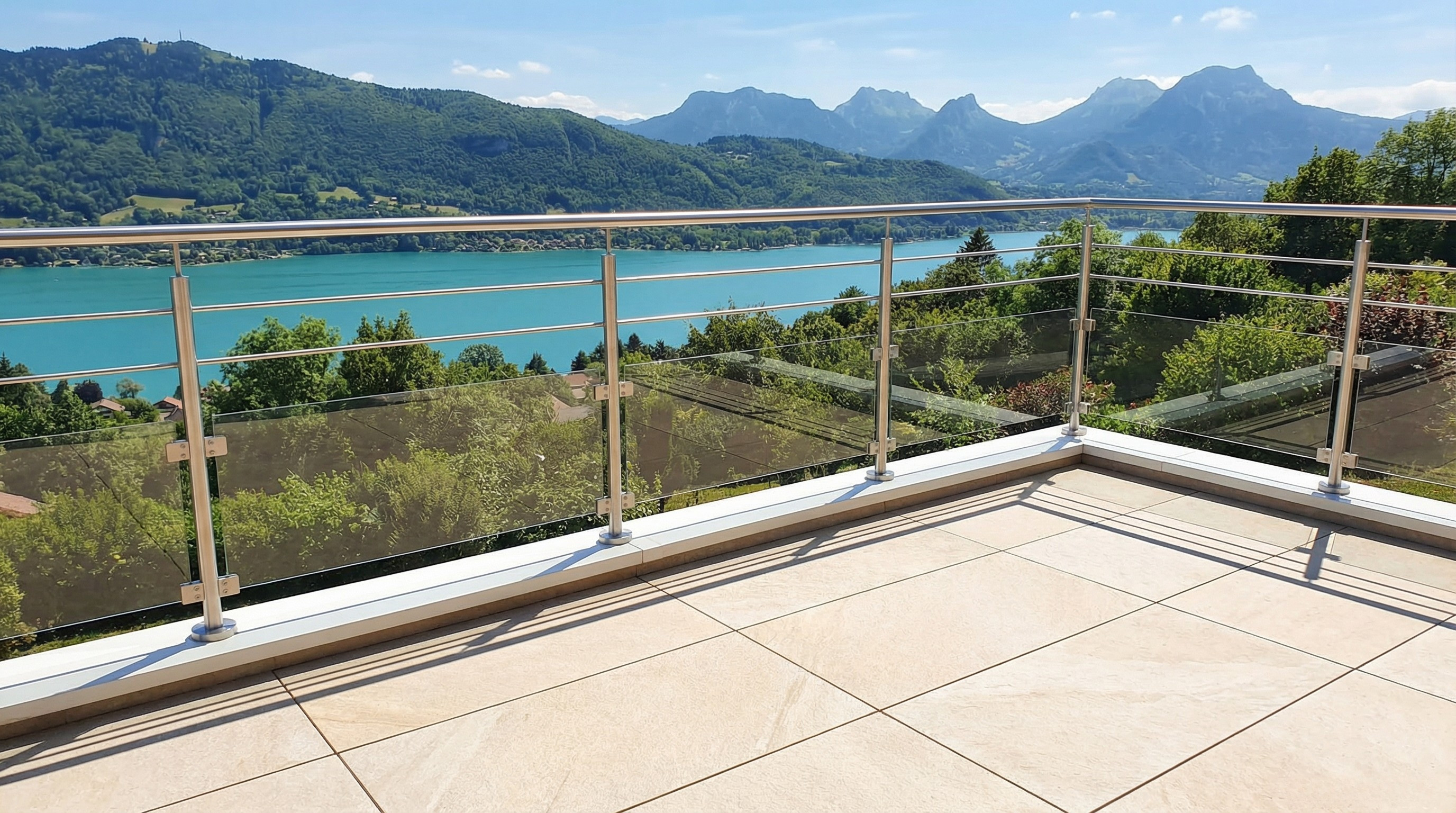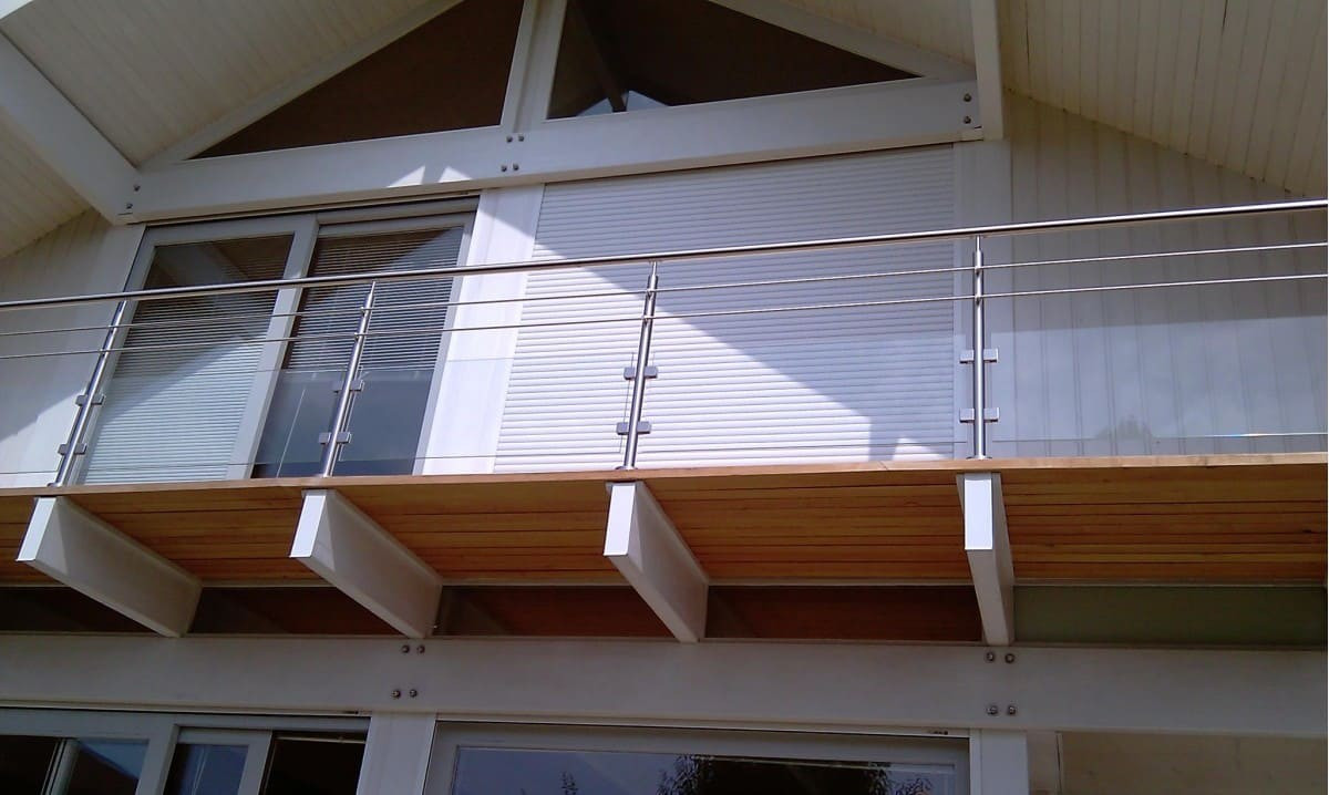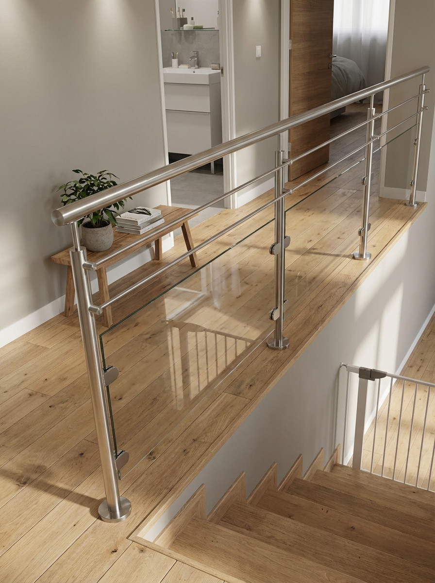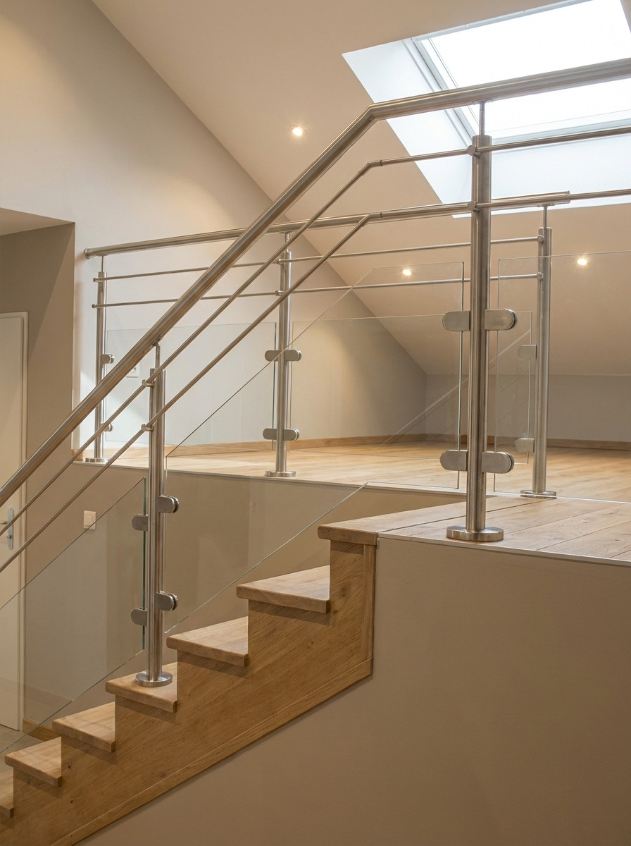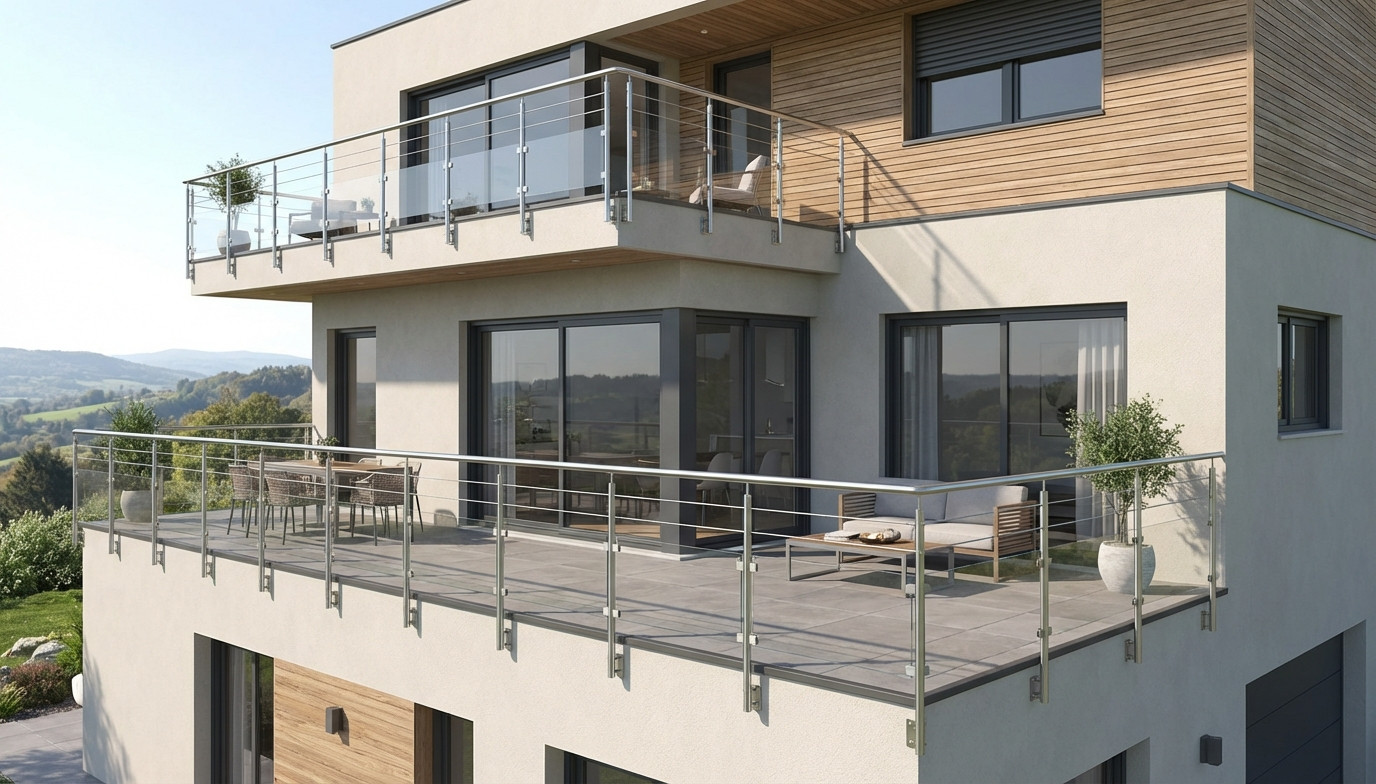 Garde-corps en inox, pose à la française ou à l'anglaise, avec remplissage vitrage et barres inox